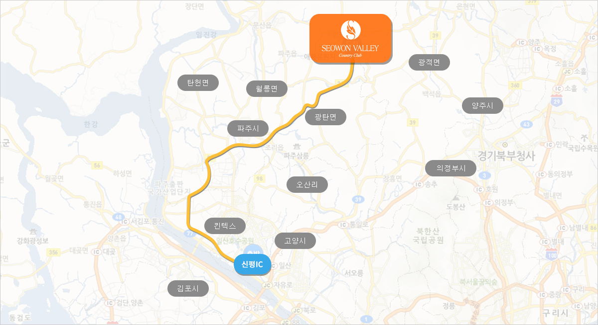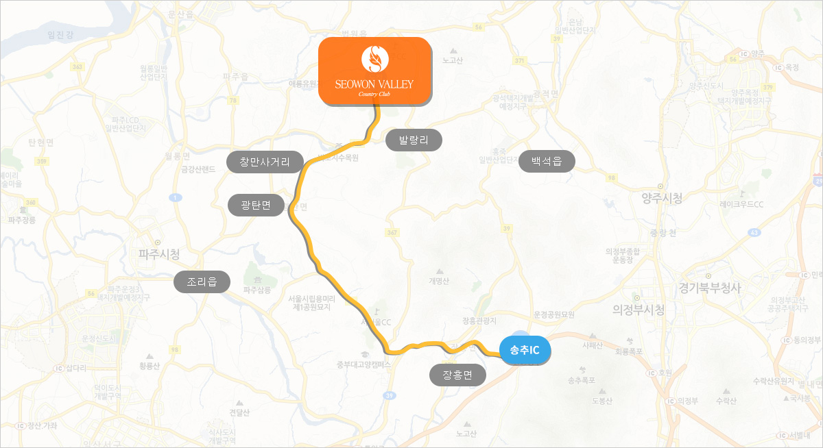 1. 송추IC(39번 국도 만나는 삼거리에서 일산,인천방향)좌회전 -2. 고양동 신삼거리(푸른마을, GS주유소 삼거리에서 광탄 보광사)우회전 -3. 농원가든 삼거리(광탄/보광사/국군벽제병원)우회전 - 4. 벽제 삼거리(광탄/용미리묘지)좌회전- 5. 혜음령터널 직진- 6. 발랑리, 마장리방면 우회전- 7. 창만 사거리 직진-8.서원힐스 도착 |