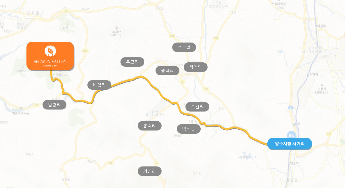 | 양주시청 사거리 | 1.양주시청 사거리(법원리/백석/광적방향:360번)좌회전 - 2.막은골 삼거리(법원리/백석/광적)직진- 3.오산 삼거리(법원리/광전:360번)우회전 -4. 백석 삼거리(파주/광적:360번 직진) - 5. 가납사거리(파주/장흥:360번)좌회전 - 6. 대성빌라 사거리(파주/연곡리 2시방향도로: 360번)직진 - 7. 석천가든 앞 삼거리(파주/비암리:360번)직진-8.서원힐스 도착 |