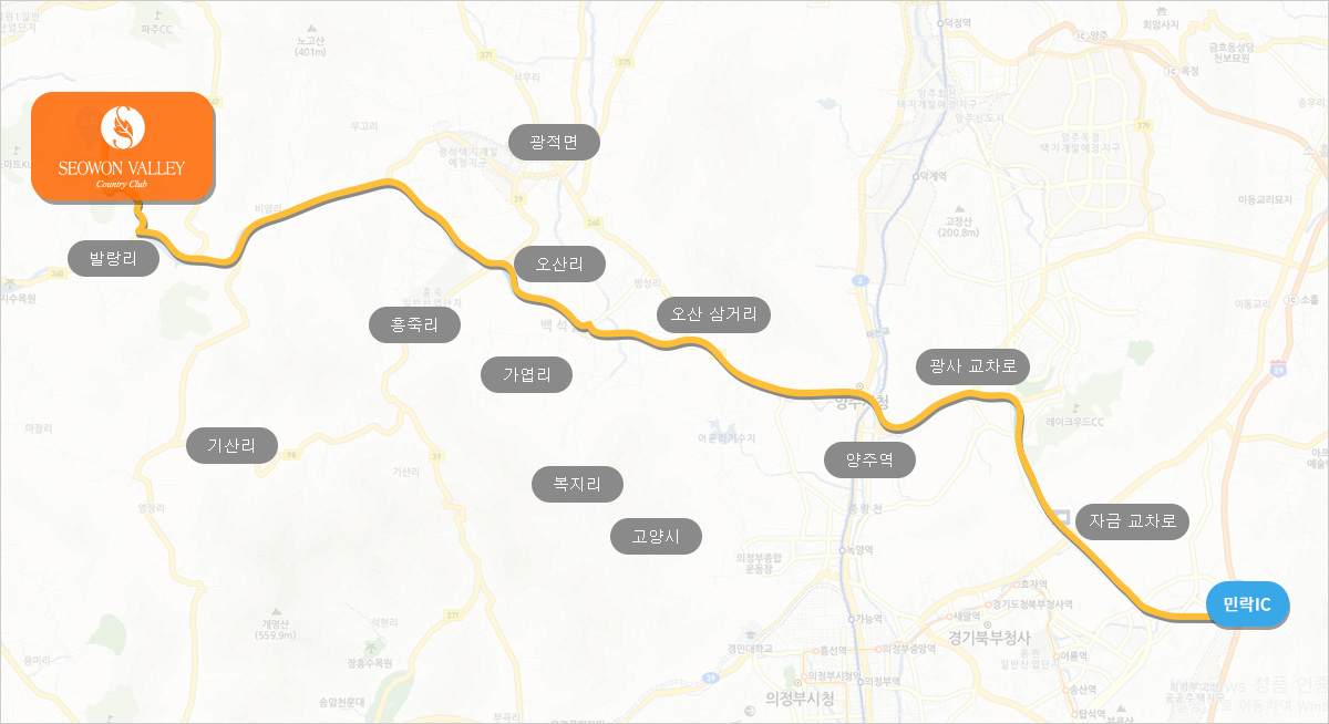 1. 민락IC - 2. 민락교차로- 3. 광사교차로- 4.양주시청 사거리(법원리/백석/광적방향:360번)좌회전 - 5.막은골 삼거리(법원리/백석/광적)직진- 6.오산 삼거리(법원리/광전:360번)우회전 -7. 백석 삼거리(파주/광적:360번 직진) - 8. 가납사거리(파주/장흥:360번)좌회전 - 9. 대성빌라 사거리(파주/연곡리 2시방향도로: 360번)직진 - 10. 석천가든 앞 삼거리(파주/비암리:360번)직진- 11. 서원힐스 도착 |